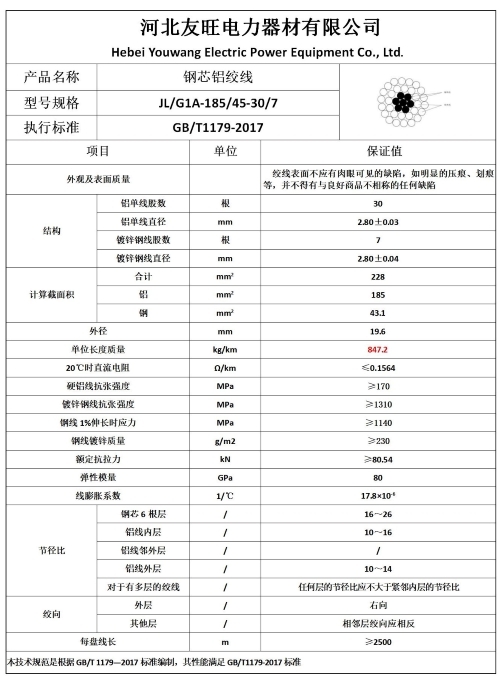 四、铁塔工程钢芯铝绞线国标生产LGJ185/45直供厂家产品基本参数及样本图片: