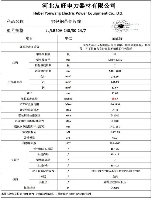 四、国标铝包钢芯铝绞线厂家JL/B20A-240/30国标价格产品参数及样本图片: