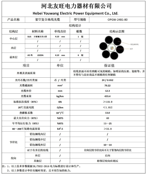 四、OPGW光缆厂家型号齐全厂家供应OPGW-24B1-80价格参数及样式图表: