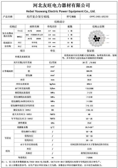 OPPC复合光缆生产厂家国标生产OPPC-24B1-185/30厂家直销价格参数及样式图表: