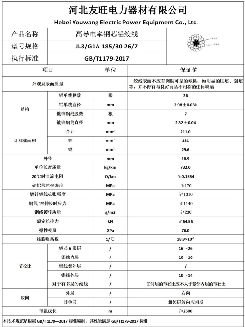 四、高导电率钢芯铝绞线JL3/G1A185/30国标生产直销价格产品基本参数及样本图片:如下图表