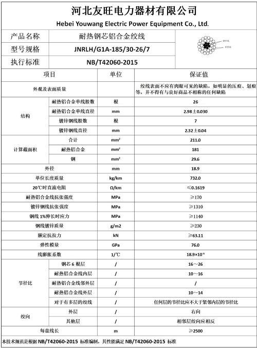 四、高强度铝合金导线JLHA1/G1A185/30多少钱一吨产品基本参数及样本图片:如下图表
