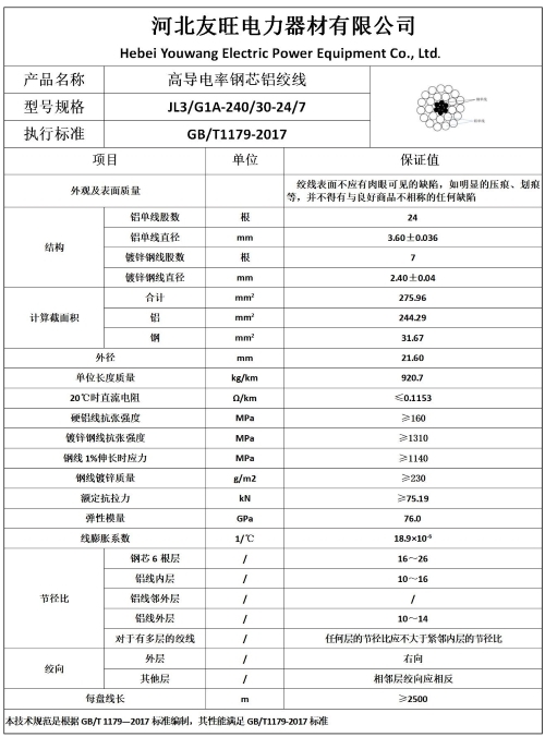四、高强度铝合金导线JLHA1/G1A240/30厂家直销产品基本参数及样本图片:如下图表