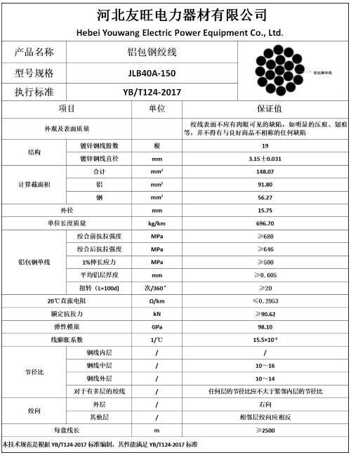 二、 产品执行标准:YB/T124-2017《铝包钢钢绞线》;