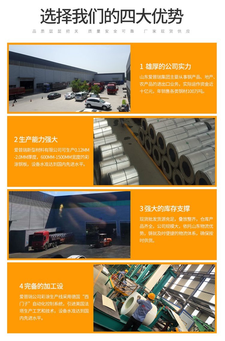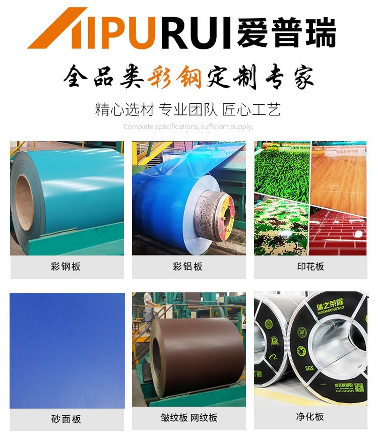 ? ? ? ?山东爱普瑞钢板可生产0.12mm-2.0mm 厚度,600mm-1500mm宽度的彩涂钢板,彩涂钢板生产过程对环境危害较小,而且可以回收利用,大大减轻了对环境的污染,而且自重较轻,可以节省承重结构用料,降低造价。彩涂板可根据需要辊压成各种形状、长度的压型钢板,中间一般无搭接,加工方便,便于施工,防水效果好。
