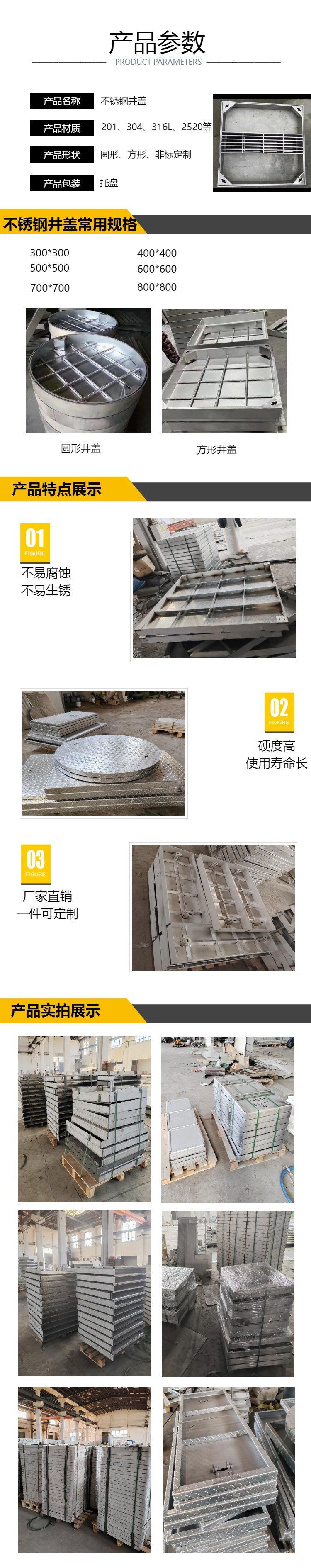 2. 轻便:不锈钢井盖相对于铸铁井盖和水泥井盖更轻,便于搬运和安装。