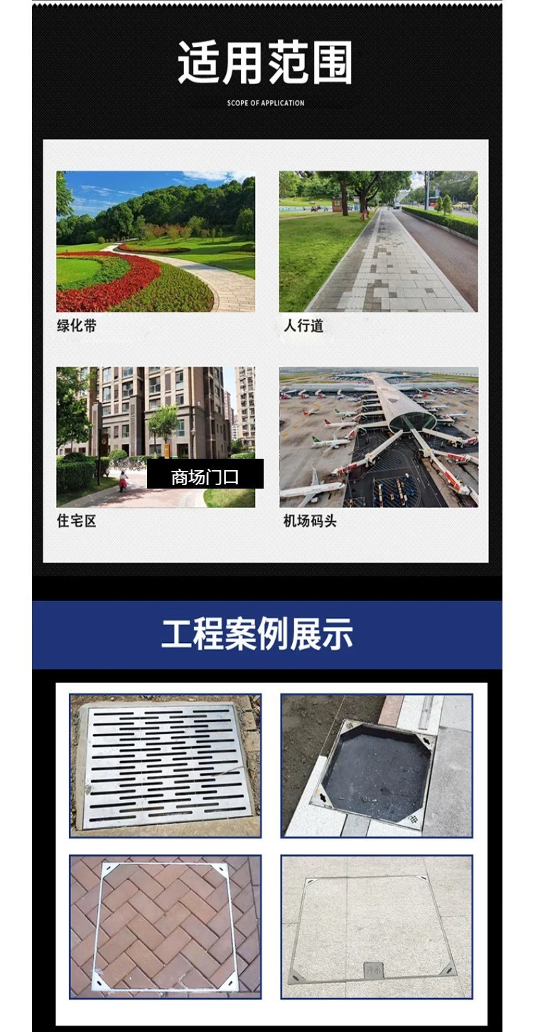 不锈钢井盖的应用范围广泛,包括城市道路、广场、公园、学校、医院等公共场所,以及工业、商业和居民小区等各个领域。在安装不锈钢井盖时,需要注意固定牢固,防止井盖移动或被盗。同时,在安装和使用过程中,还需要注意井盖符号、内外盖设置、井盖内部设置和承载能力等要求,确保井盖的安全性和稳定性。