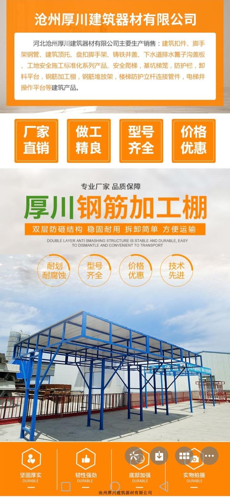 沧州厚川建筑器材有限公司专业生产、建筑用建筑器材,产品有建筑扣件、架子管、脚手架、建筑顶托空心丝杠、实心丝杠、盘扣脚手架、卸货平台、电梯防护门、钢筋加工棚、电梯防护平台、安全通道工准化等产品。 我厂具有丰富的实践经验,专业配套,工作协调我厂生产的产品广泛引用在国内各地的建筑工程中,受到广大用户广泛的好评。