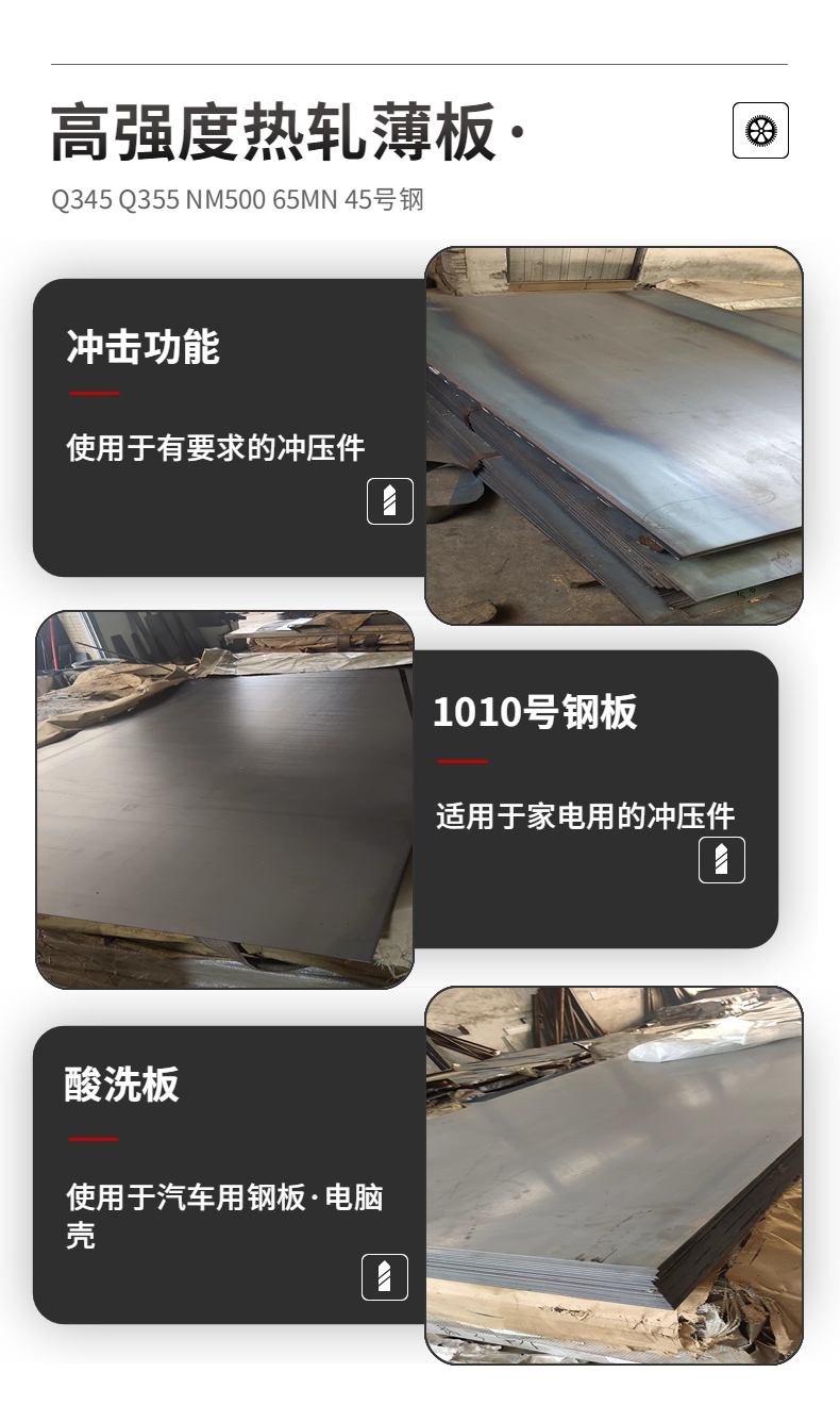冷轧优质薄钢板:主要包括各种优质钢冷轧薄板, 常用的是碳素结构钢板,尤其是深冲压用冷轧薄钢板,是由低碳优质钢08Al冷轧的薄板,钢板按表面质量分为三组;Ⅰ、Ⅱ、Ⅲ,分别表示特别高级、高级、较高的精整表面,按拉延级别分为ZF、HF、F级(代表用于冲制拉延 复杂、很复杂、复杂的零件),根据钢板厚度允许偏差,又分为A、B两级精度、广泛用于汽车拖拉机工业。冷轧钢板,表面光洁,加工优良,用于汽车、冰箱、洗衣机等家电,以及产业设备、各种建筑材料。随着经济发展,冷轧钢板已被称为现代社会的必须材料。 冷轧产品的分类: 热轧酸洗、轧硬卷、普通冷轧、镀锌(电镀锌、耐指纹、热镀锌)、镀铝锌、电镀锡、彩涂、电工钢(矽钢片)等。 1、热轧酸洗: