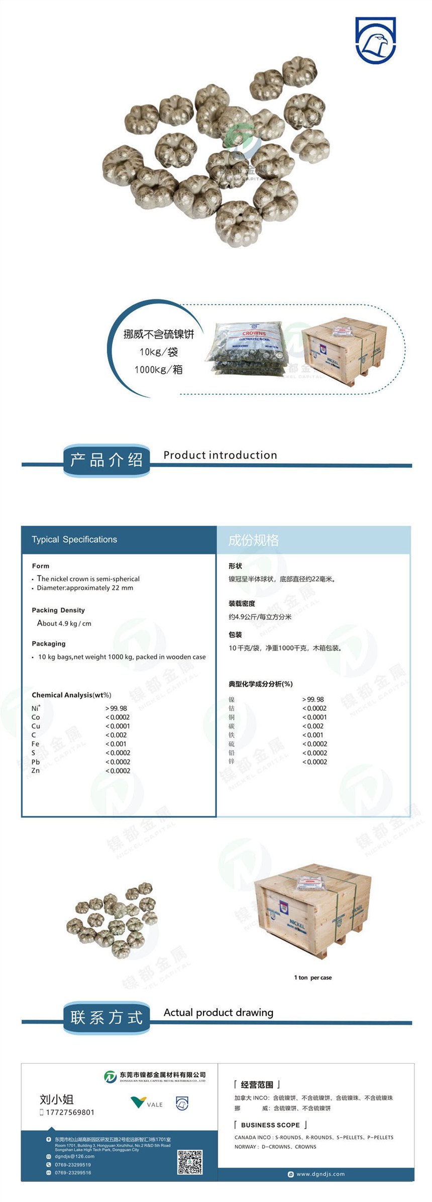 电解镍是使用电解法制成的镍。将富集的硫化物矿焙烧成氧化物,用炭还原成粗镍,再经电解得纯金属镍。包装采用真空袋装,外用铁桶包装。