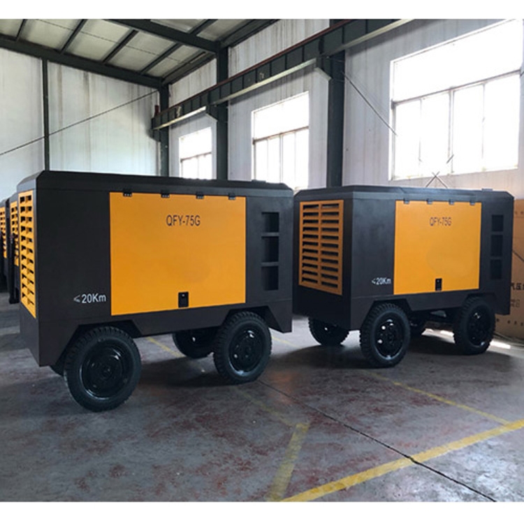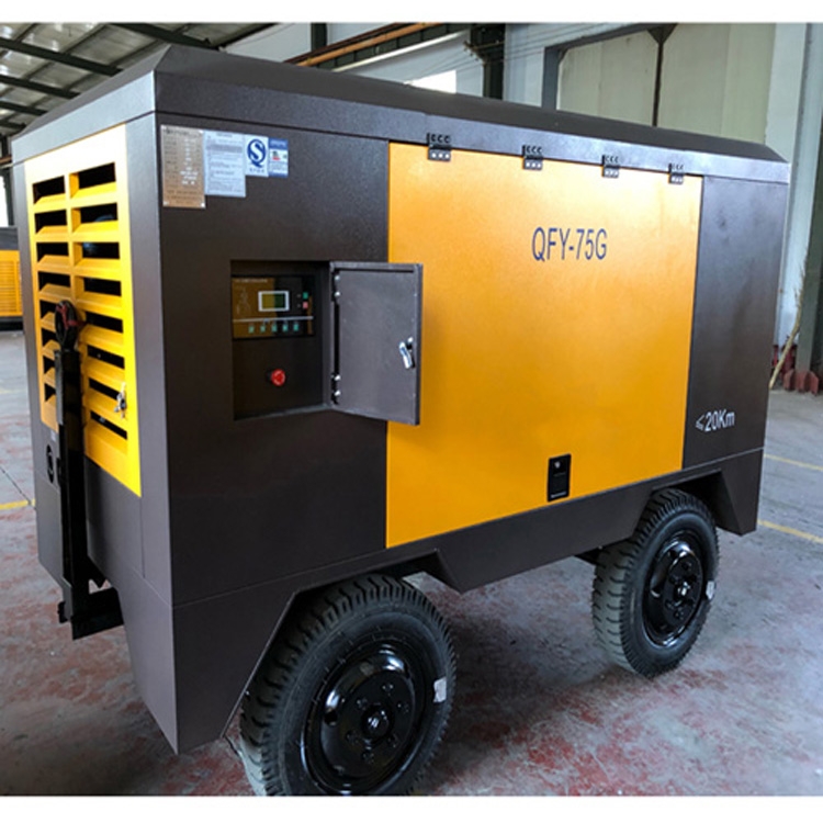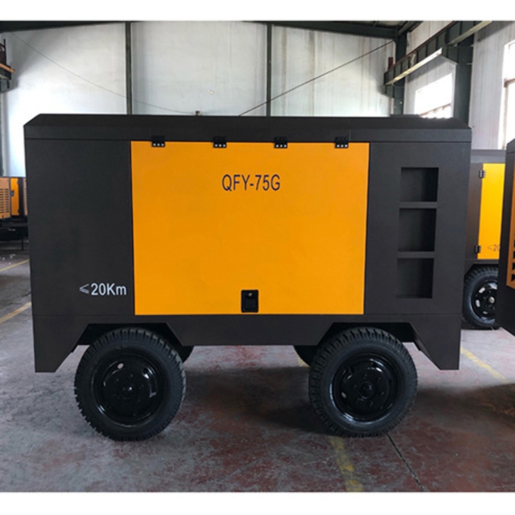 型号:QFY-75G,驱动方式:直联,电机功率:75千瓦,排气量:13立方每分钟,工作压力:8-13公斤,外形尺寸:2850*1460*1870,重量:1800公斤,四轮移动带牵引,内部自带缓冲罐,隧道矿山潜孔钻凿岩机、喷浆护坡用螺杆空压机。