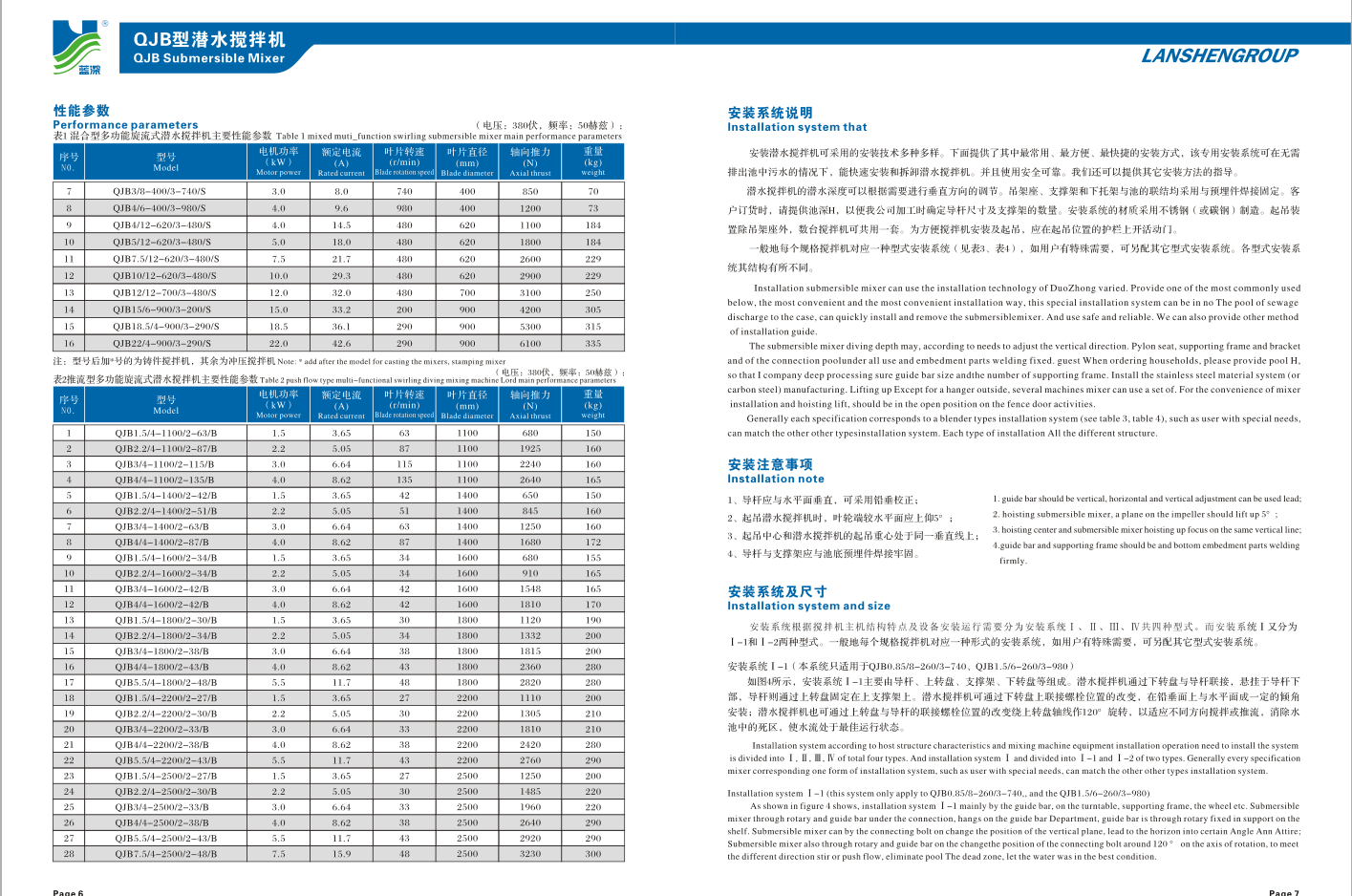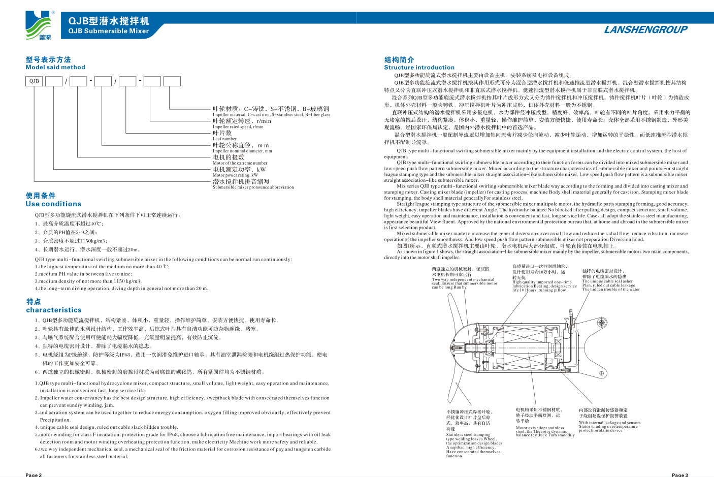 蓝深QJB4/12潜水搅拌机能在全浸没的条件下连续运行、间歇运行,潜水搅拌器在整个运行过程中须保持无振动平稳运行,产品设计使用寿命15年,无故障运行时间8000小时。
