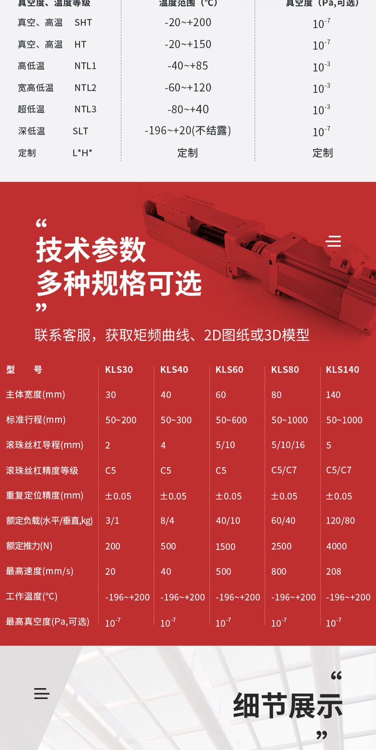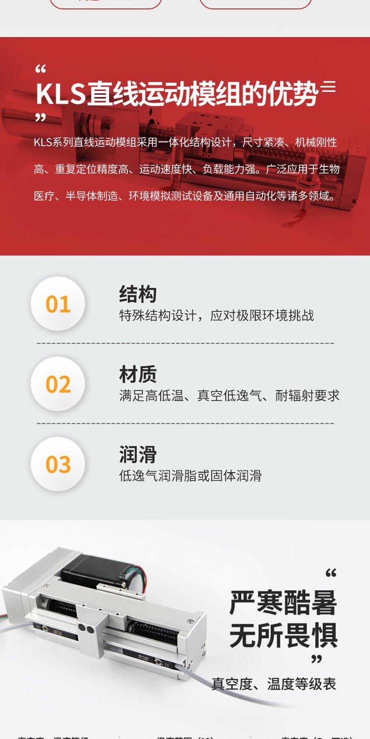 直线模组高低温温度-196/ 200℃真空1E-7Pa辐射1E7Gy精度0.05mm 品牌 | kingsni | ||