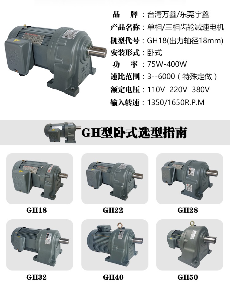 可定制齿轮减速马达GH22-100-60A单相宇鑫卧式齿轮减速电机
