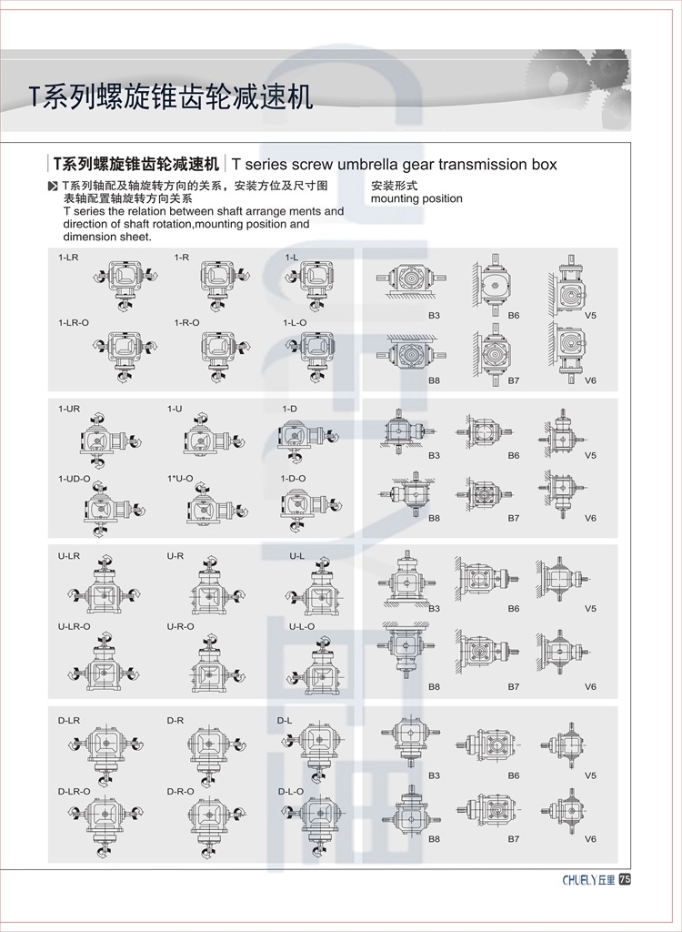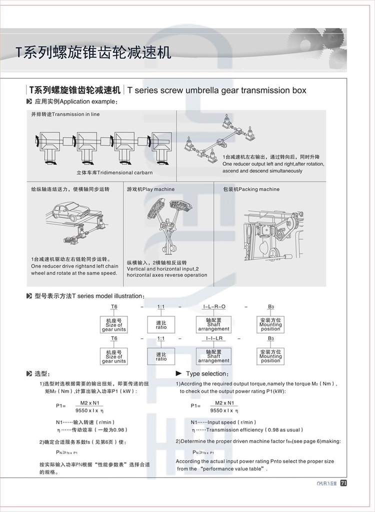 1、T系列螺旋伞齿轮转向箱,标准化,多品种, 速比全部为实际传动比。平均效率达98% 。