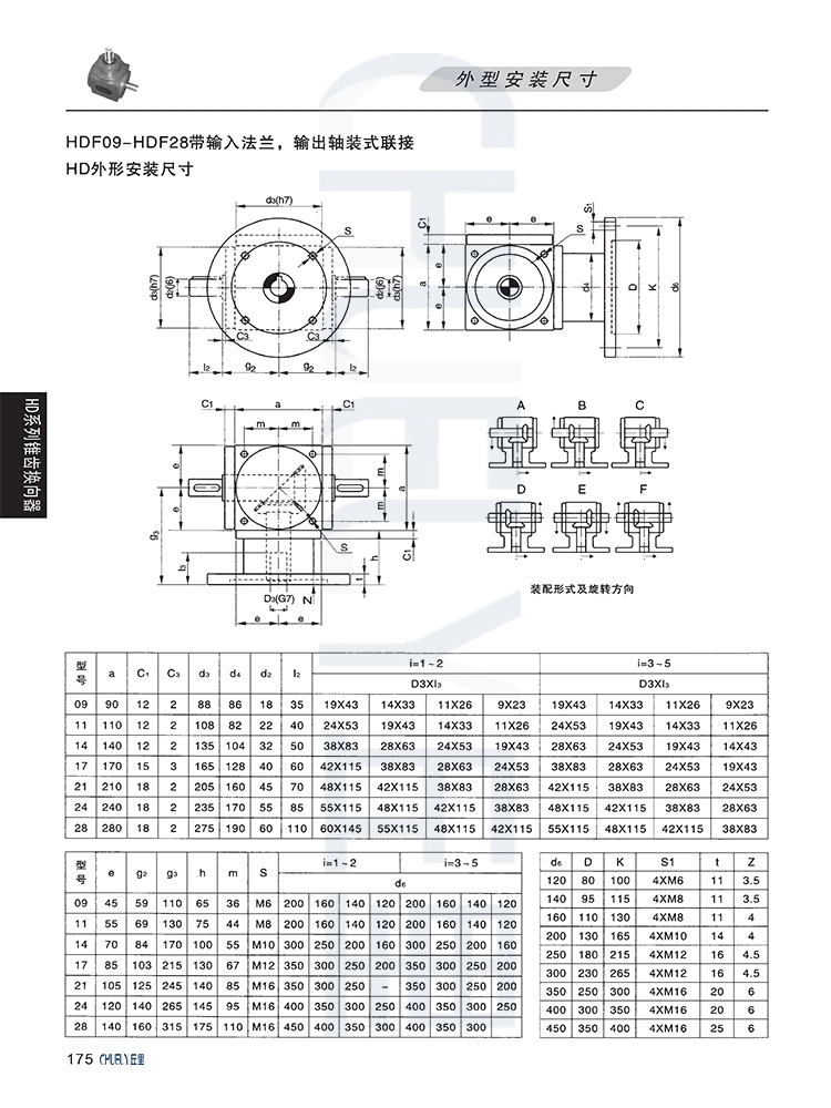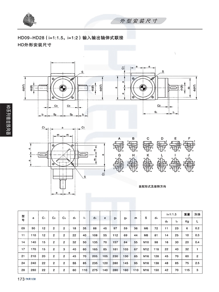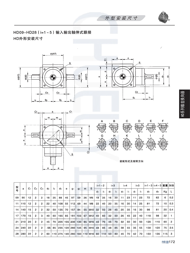 4、HD系列换向器共有七种规格,选型范围大,输出轴形式多样,可满足多种场
