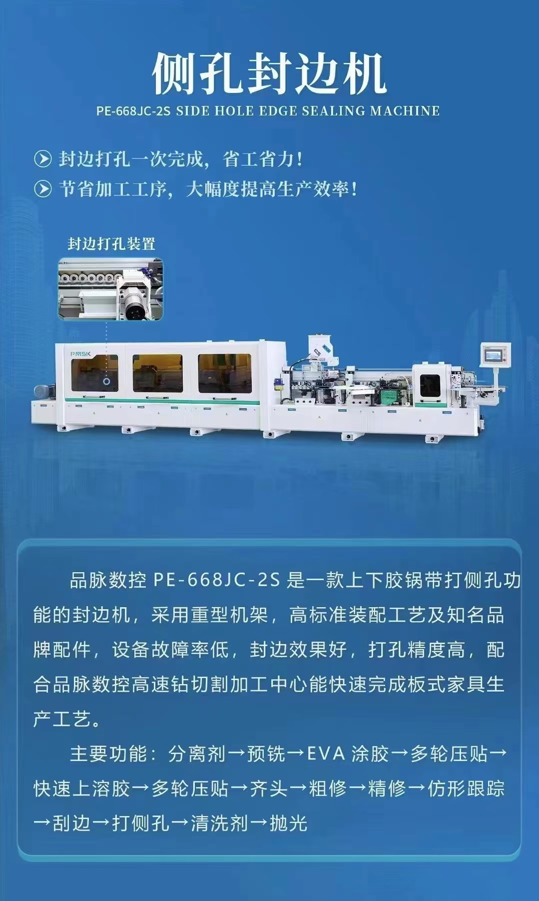 品脉数控PE-668JC-2S是一款上下胶锅带打侧孔功能的封边机,采用重型机架,高标准装配工艺及知名品牌配件,设备故障率低,封边效果好,打孔精度高,配合品脉数控高速钻切割加工中心能快速完成板式家具生产工艺。