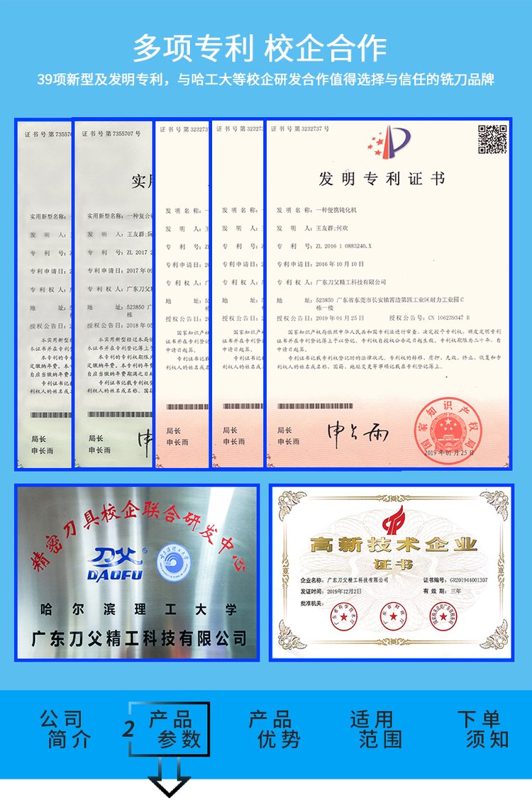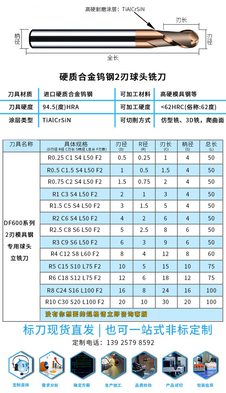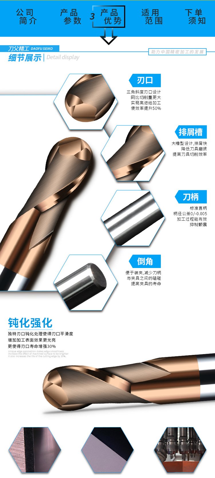 加工范围 | HRC48-62°模具钢、淬火钢、调质钢专用铣刀 | ||