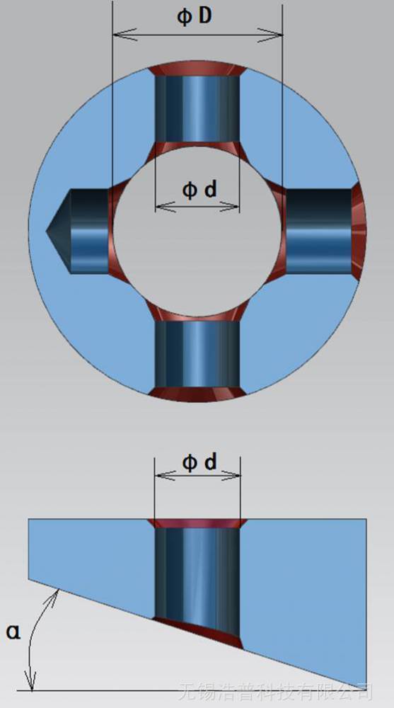 ? 如果基孔和主孔的孔径比(d:D)大于0.5,表示其斜度大于18°,我们只能修改刀片主偏角和后角来实现(需要测试能否满足客户要求)d:D≤0.5