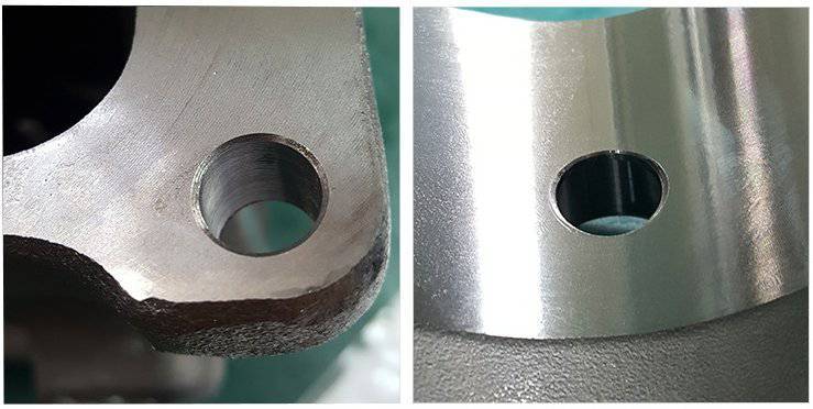 对于交叉孔,相交叉的两个孔径大小有2.5倍以上差距,使用效果比较好,低于2.5倍径的话可能会有倒角不完整,毛刺去不干净的情况。椭圆孔、破口孔不能使用。
