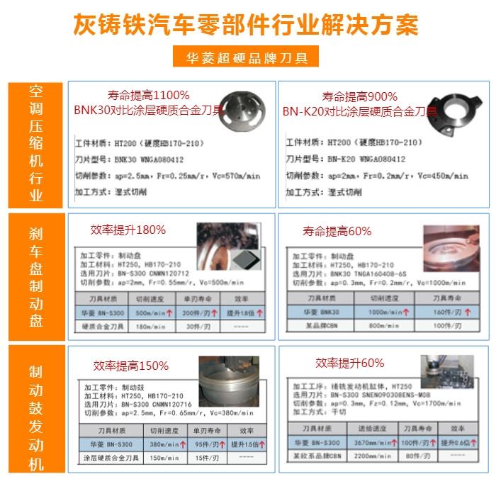 汽车零部件中,空调压缩机零部件(法兰、气缸)、刹车盘、制动鼓、发动机等零件多采用灰铸铁作为主要材料,批量生产过程中对刀具性能要求较高,采用华菱超硬多刃口镶嵌式CBN刀片BNK30和BN-K20材质,整体CBN刀具BN-S300材质加工,可高速切削,提高加工效率,并保证较高的表面光洁度。