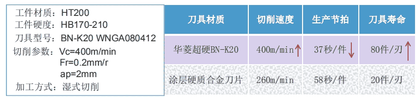 空调压缩机零部件——气缸,常用材质有灰铁HT200,硬度在HB170-210,粗加工的余量一般在3mm左右,之前选择涂层硬质合金刀具,切削速度低,而且耐磨性不好,刀具寿命不高,一个刃口加工的工件件数少,需要经常换刀,导致加工效率低下、刀具耗费增加。通过近几年超硬刀具的成熟应用,粗加工灰铸铁件气缸更高效的刀具材质推荐立方氮化硼刀片BN-S300牌号。