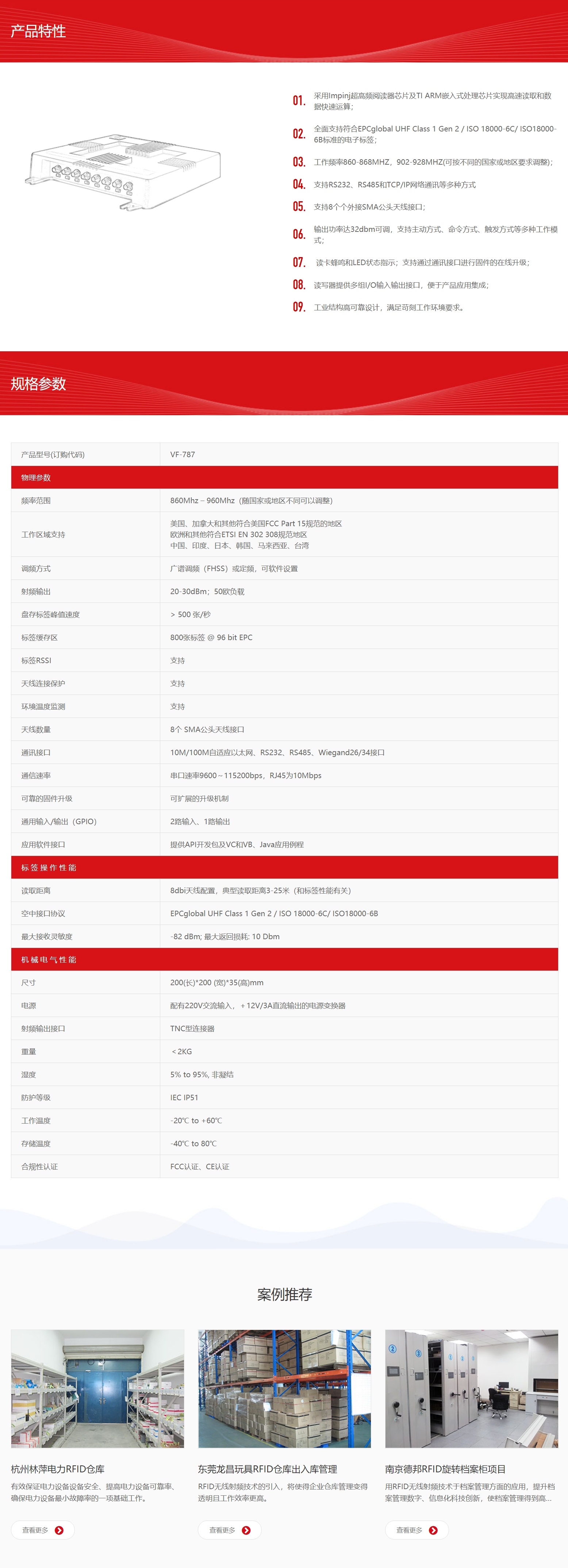 读取距离 | 8dbi天线配置,典型读取距离3-25米 | ||