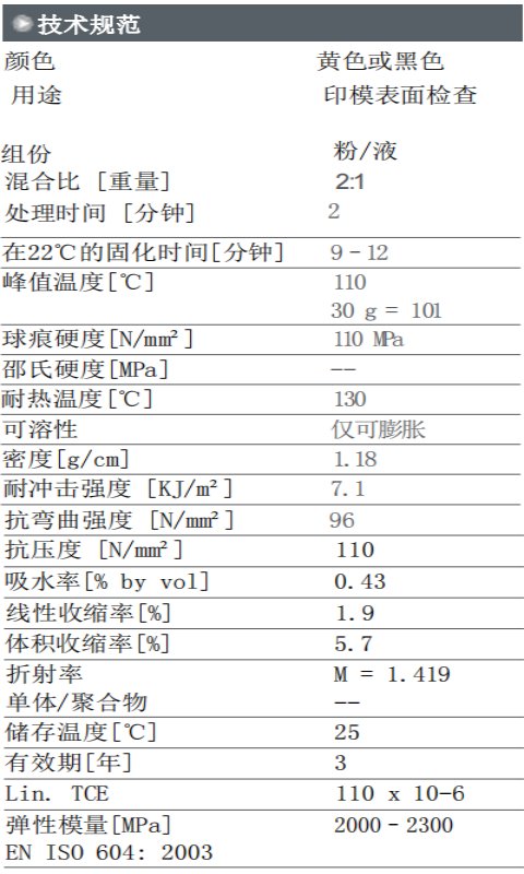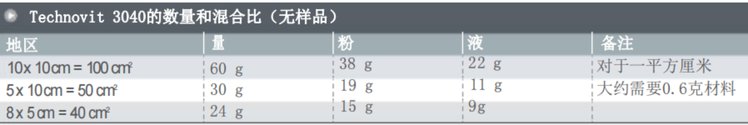 双组份树脂由粉末和液体组分组成。根据要求,材料可 以按1:1至3:1的比例混合(粉末/液体)。