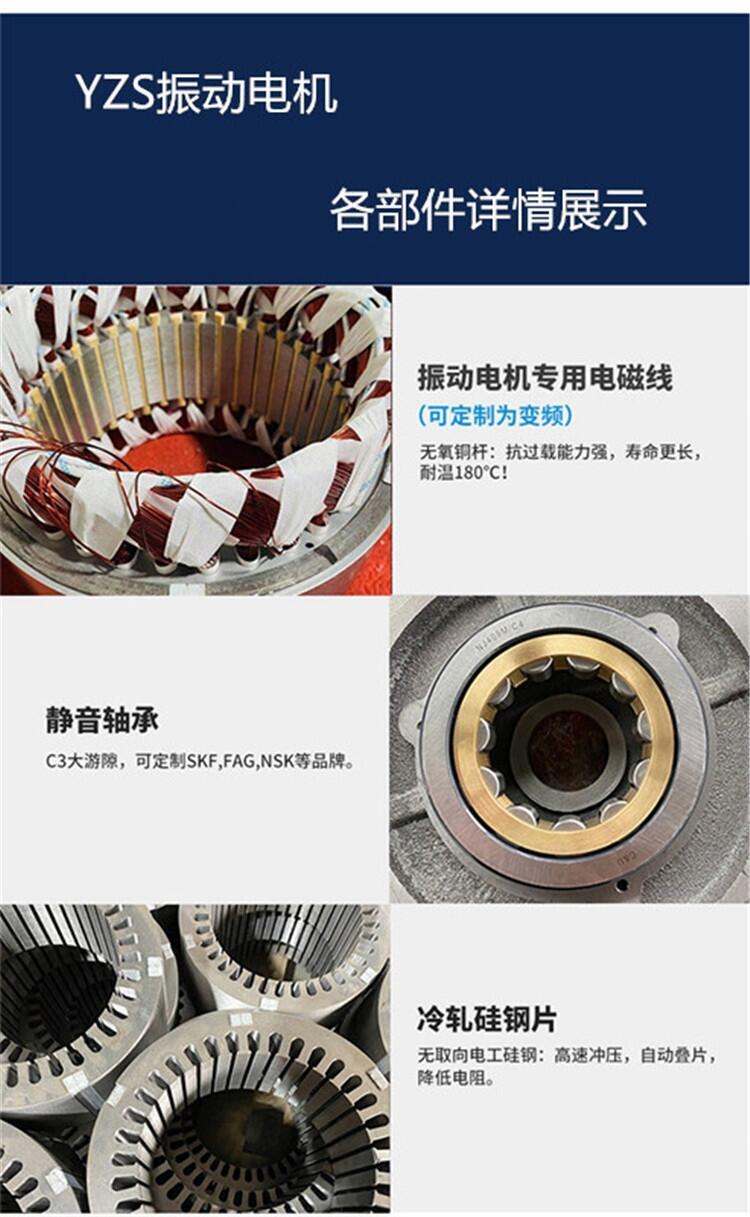 YZS系列振动电机是节能型的振动电机,激振力利用率高,但能耗小、噪音低、寿命长。激振力只要进行简单的操作即可达到无级调节。YZS系列振动电机为通用型振动电机。该系列振动电机可以广泛的应用在采矿、煤炭、冶金、水电建设、火力发电、建筑、建材、化工、粮食、轻工等工业部门振动筛分机械,如:振动破碎机、振动筛分机、振动打包机、振动落砂机、振动造型机、振动打桩机、振动提升机、振动充填机、料仓的振动破拱防闭塞装置等等。