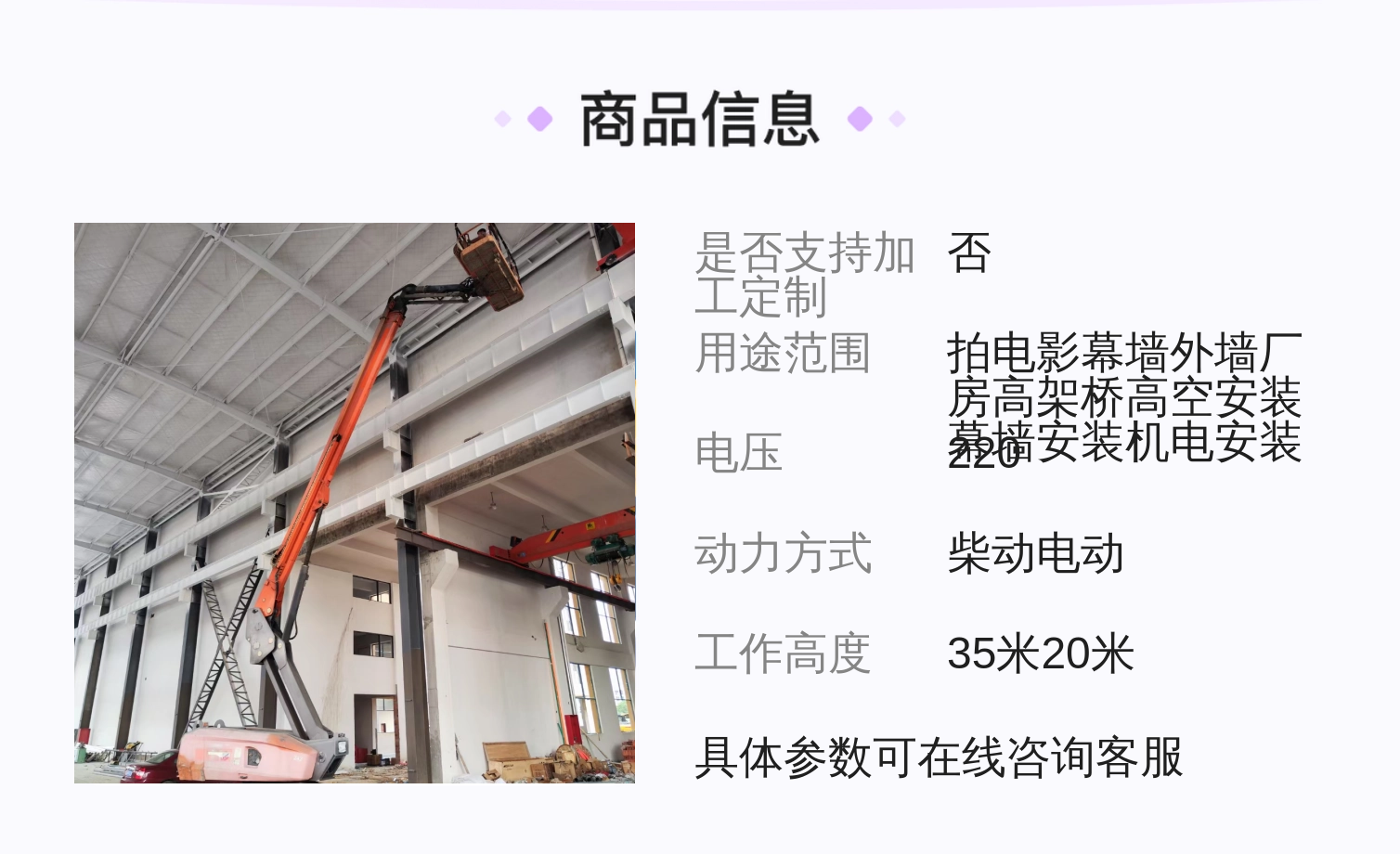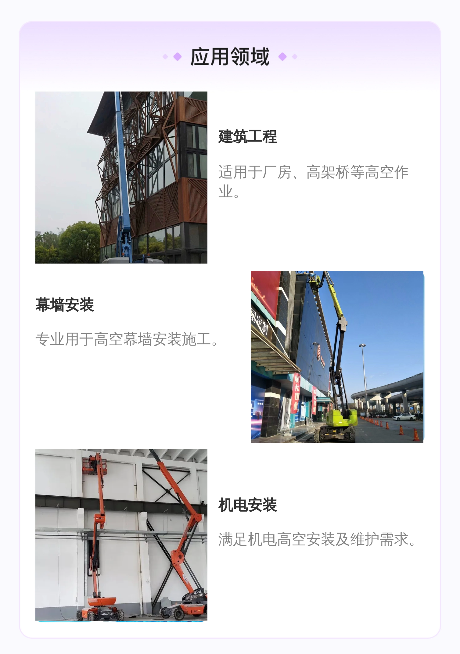 用途范围 | 拍电影幕墙外墙厂房高架桥高空安装幕墙安装机电安装 | ||
