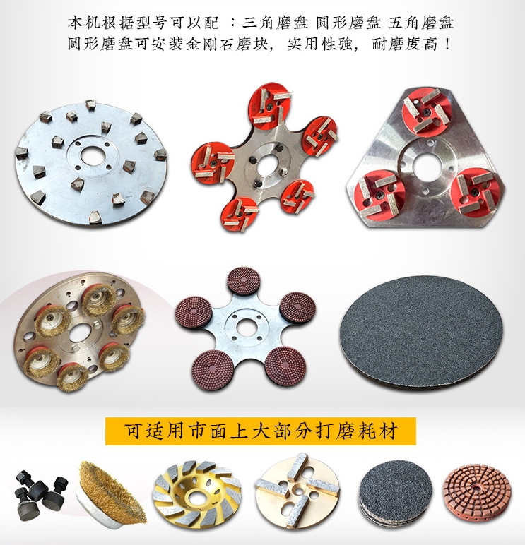 1、可自由更换底盘,耗材可以自由配置(金刚石,砂轮片),装金刚石磨头主要用于水泥素地、旧环氧地面的打磨;装砂纸盘用于中涂腻子层打磨。