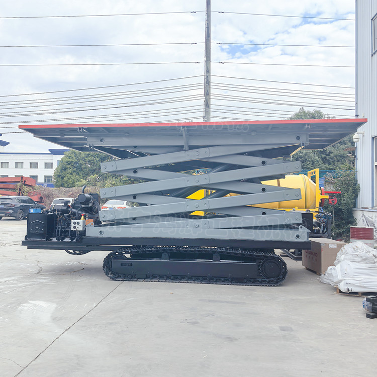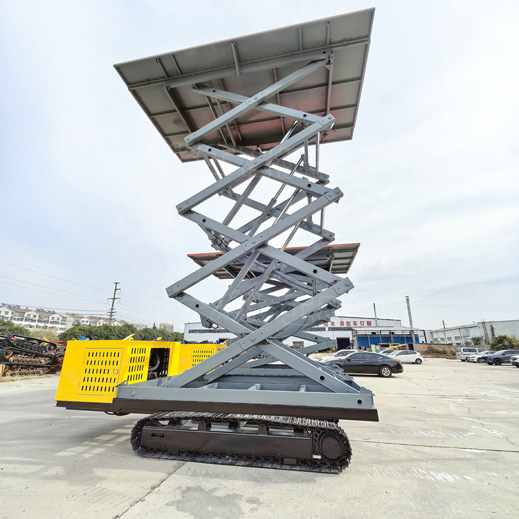 履带升降平台是一种?自带履带行走系统的高空作业设备?,结合液压升降机构和控制单元,可在复杂地形实现稳定移动与精准升降。其核心原理是通过液压系统驱动油缸伸缩(液压泵输出压力油液→推动活塞运动→带动平台垂直升降),同时履带底盘提供地面适应力?12。动力可选柴油发动机(野外无电源环境)或蓄电池(低噪音室内场景)?28。