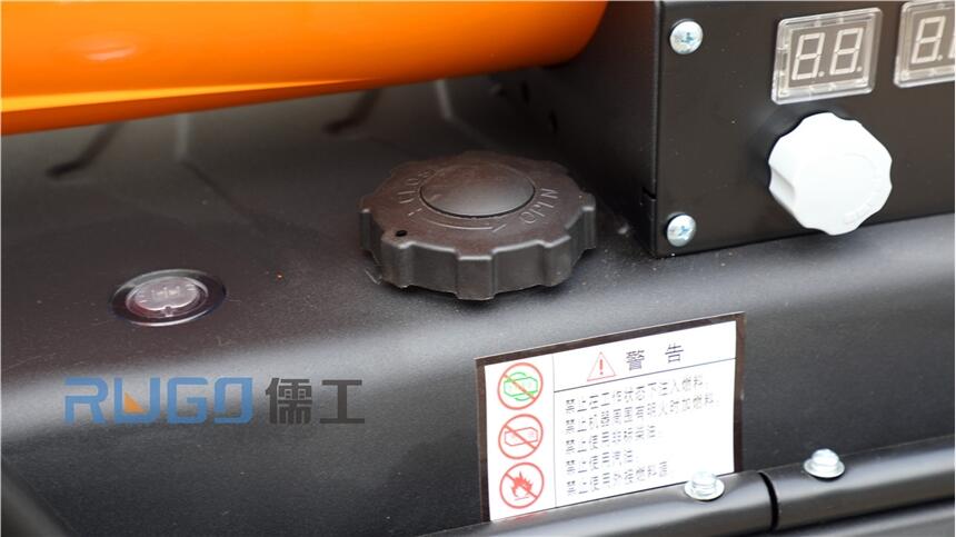 现在介绍这款机器是50KW的燃油暖风机,我们这款机器的供热面积可以达到260平左右,咱们的大棚不要高于3米,高于三米效果会有所降低。我们这台机器重量大概在30公斤左右,机器下面有两个轮子移动起来也是非常方便的,我们这台机器操作也是非常方便的,您那边只需要把机器加满油,通上家用电,然后打开开关就可以了,我们这台机器是可以5-55度进行调节的,根据咱们的要求来调节温度,例如咱们育雏要到35度,只需要把机器的温度调节到35度就可以了,调节温度的时候机器上的显示屏都会有所显示的,咱们能更加直接的看到温度。