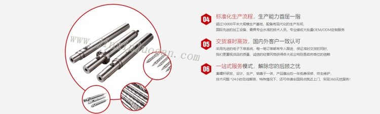 可生产:berstorff(贝尔斯托夫)、boy、?netstal、demag(india)、东芝(上海)公司、funuc(发那科)、巴顿菲尔、辛辛那提、fcs(富强鑫)、台湾祝有、南嵘(nanrong)、clf(全立发)、震德、海天、震雄(chenhsong)、力劲、华大、东华、elite(亿利达)、琮玮、韩国宇进、日本住友(sumitomo)、sumida、联塑,鸿绮,钜钢、元锋、雄塑等塑机生产及配套厂家的螺杆,料筒的开发与制造,产品广泛适用于各种橡胶塑料挤出,主诉机械设备,如:板材片材机,吹膜制袋机,食品机,制药机,饲料机,涂料机,打包带机,发泡机,造粒机,编织袋拉丝机,造纸设备,电线电缆设备等。主要产品有精密螺杆料筒(氮化螺杆料筒、双合金螺杆料管、不锈钢螺杆料筒、全硬化螺杆、高速工具钢螺杆料筒):注塑机螺杆料筒、挤出机螺杆机筒、吹塑机螺杆料筒、化纤机螺杆料筒、单螺杆料筒、平行双螺杆炮筒、锥形双螺杆料筒、螺杆料管附件;产品选用优质38CrMoALA;优质SACM645;优质SKD11;优质SKD61;9Cr18MoV等优质材料,经调质、成型。表面分别可进行氮化,镀硬烙、喷焊硬质合金等工艺。产品具有高耐磨,抗腐蚀及使用寿命长等优点。