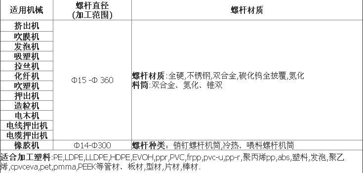 ? ?公司主要产品有精密螺杆料筒(氮化螺杆料筒、双合金螺杆料管、不锈钢螺杆料筒、全硬化螺杆、高速工具钢螺杆料筒):注塑机螺杆料筒、挤出机螺杆机筒、吹塑机螺杆料筒、化纤机螺杆料筒、单螺杆料筒、平行双螺杆炮筒、锥形双螺杆料筒、螺杆料管附件;产品选用优质38CrMoALA;优质SACM645;优质SKD11;优质SKD61;9Cr18MoV等优质材料,经调质、成型。表面分别可进行氮化,镀硬烙、喷焊硬质合金等工艺。产品具有高耐磨,抗腐蚀及使用寿命长等优点。获得广泛的塑机、注塑及塑胶厂家采用。?