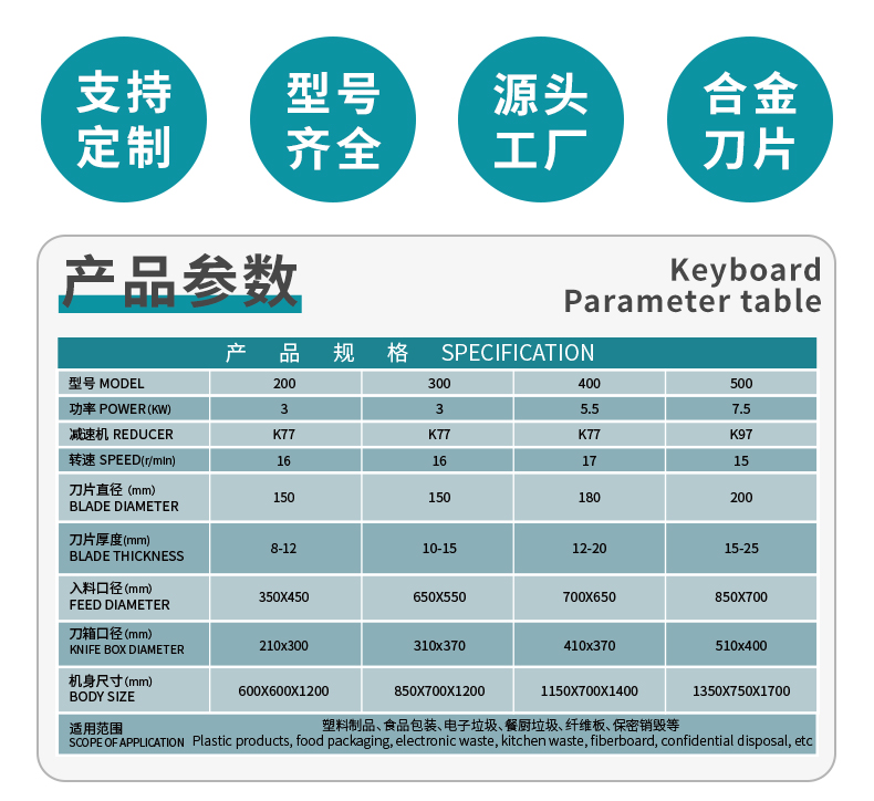 用途范围 | 废旧金属、废旧家具、报废汽车、废家电、生活垃圾、木材、橡胶轮胎、汽车报废拆解、电子制造、托板制造、木材加工、生活垃圾回收、塑料回收、轮胎回收 | ||