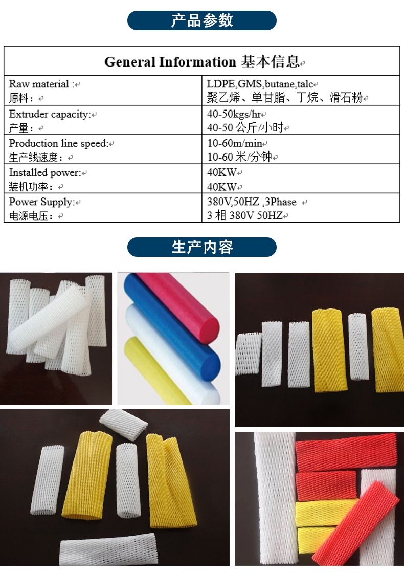 (1)使用原料:低密度高压聚乙烯、滑石粉5—10千克/吨,丁烷气200千克/吨,塑之宝20—25千克/吨。