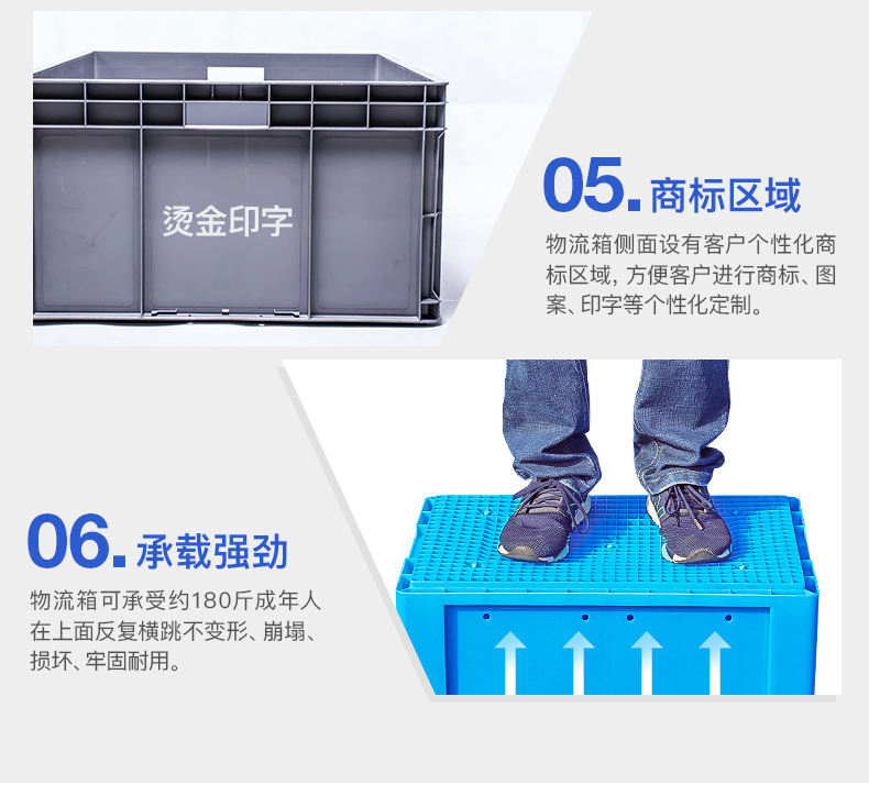产品的特点:1.无障碍把手设计:箱体四周有新型无障碍把手,符合人体工学原理,便于操作人员更安全的抓取箱体,使搬运方便便捷。2.加强筋设计:箱体四角的加强筋设计,提高箱体的承载能力和堆垛的稳定性。3.网状结构设计:箱体底部密集的小方格加强筋设计,增加了箱体的载重能力,使箱体在流利架和滚道流水线上顺利进行。4.大平面设计:侧面大平面设计,不易积灰,易于清洗,便于客户根据需要进行丝网印刷和烫金。5.卡扣式铰链设计:箱盖与箱体之间卡扣式铰链结构,既增加了链接的强度,也保证了箱盖的可拆卸性,可选择性,也满足了不同客户的需求。