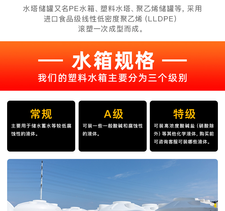 我们的产品还有三种等级,标准型常用作蓄水箱,作用于低腐蚀性的液体。A类水箱可装一般腐蚀性和酸碱性的液体。特级水箱,可装高浓度酸碱盐液体(硝酸除外)。产品展示一般为标准型,购买前请联系客服需要装哪些液体。