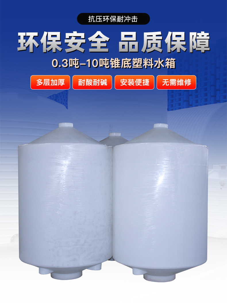 锥底水箱,又名尖底水箱,塑料水箱,塑胶水箱。采用进口食品级线性低密度聚乙烯(LLDPE)材质,由滚塑工艺一次成型。
