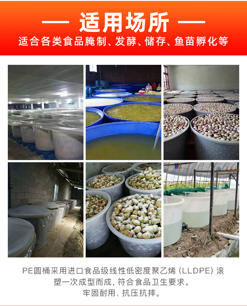 在食品行业,可作为食品存放桶,腌制桶,发酵桶使用。在制酒行业可作为酒缸,酒糟发酵缸使用,在服装行业可作为漂洗桶,印染桶使用等,产品不限于任何行业,只要您有需要,都可以选择我们的产品。