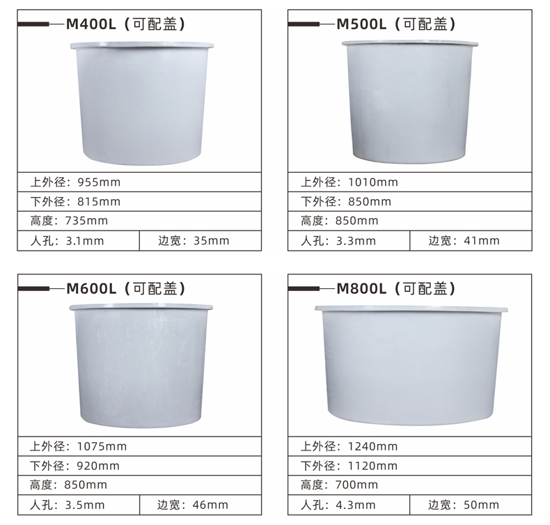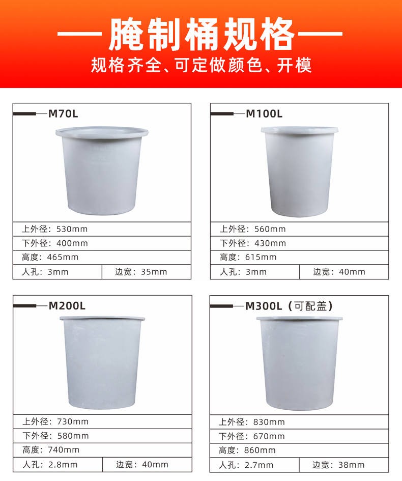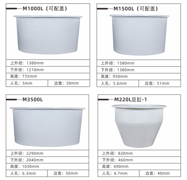 产品型号多种多样,圆桶小的有70L装,大的有3500L装,此外还设计了几种不同的型号供买家选择,有豆缸,料斗,鱼桶,酒缸,腌制桶。根据不同的用途可选择不同的型号款式。