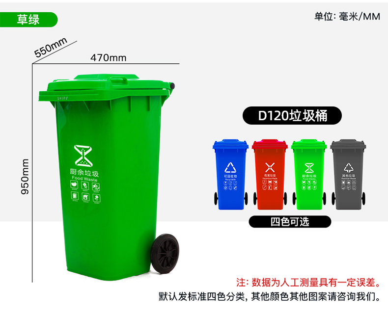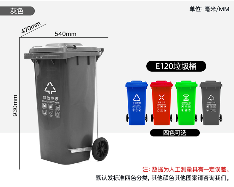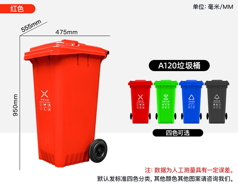 本公司生产的垃圾桶,种类丰富多样,颜色各异。我们的垃圾桶也是符合垃圾分类标识,蓝色垃圾桶为可回收物,红色垃圾桶为有害垃圾,绿色为餐厨垃圾,灰色为其它垃圾。垃圾桶颜色各异,使用者可按照自己随意使用。