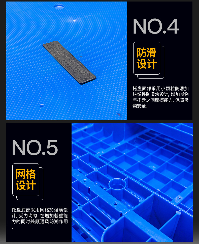 托盘有防滑设计,在垫脚和平面均安装防滑垫,增加货物与托盘之间的摩擦力。使拖盘在地面堆放或者多层堆叠上不易打滑或滑落。