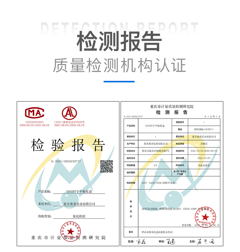 托盘使用了合格的原料制成,我们在对产品的质量上有严格的要求。托盘可多次反复使用,不易损坏,托盘通过了产品质量检测,有着产品检测报告,可放心使用。