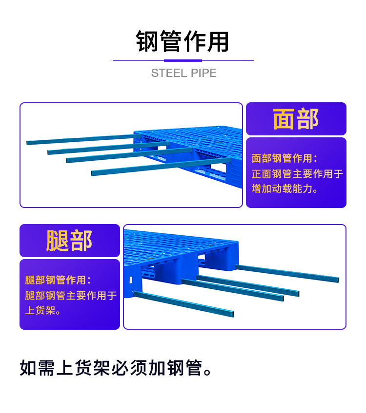 托盘在超出承重上作出了合理的设计,我们在托盘的承载面和腿部增加了钢管孔,在对超出托盘的承重下,我们可以选择添加钢管,根据客服的需要可添加3-8根钢管,大大增加了托盘的承重。温馨提示:在托盘需要上货架的情况下必须加钢管。