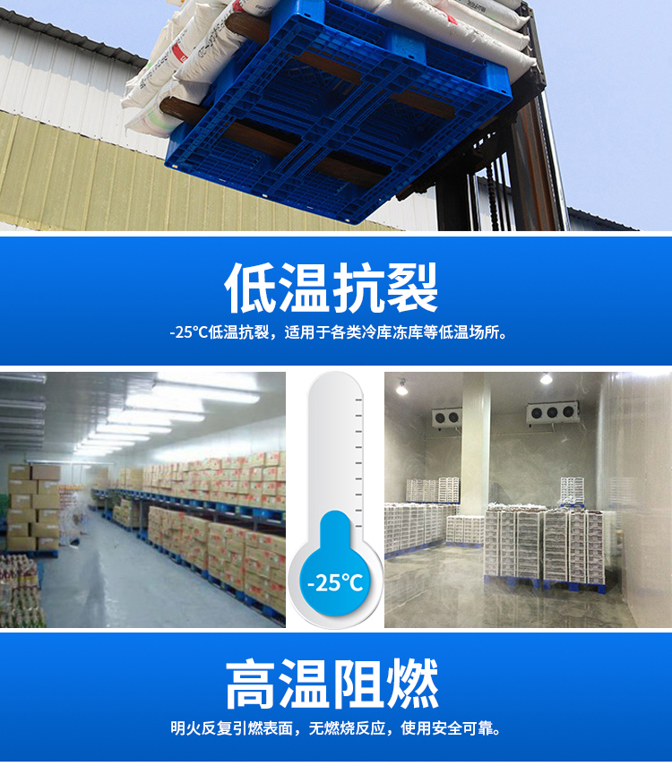 托盘可在多种环境下使用。在低温环境下不会出现干裂,冷冻的情况,在高温环境下不会出现软化,滚烫的情况。