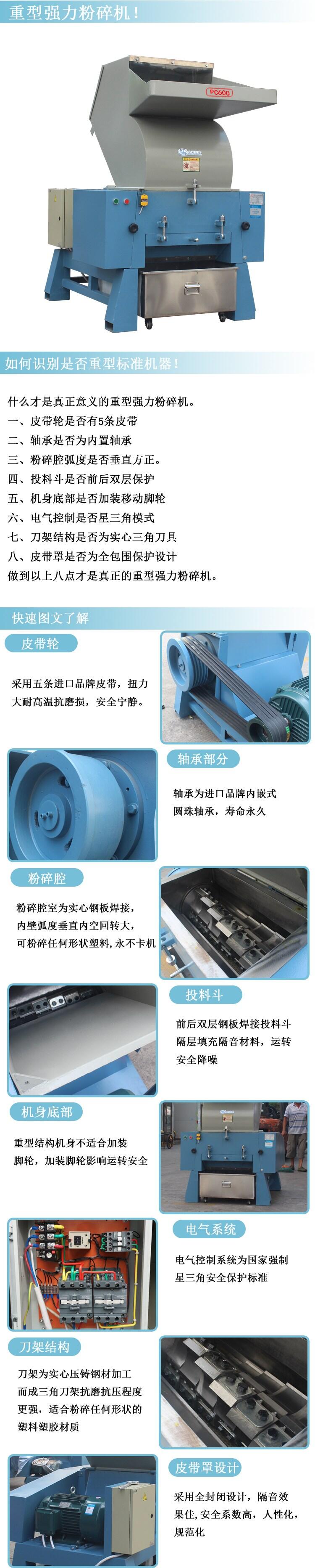 适用于各种次料之粉碎再利用,尤其对各类硬性塑料(如料头,鞋楦料等)及软胶,薄膜,尼龙,片材,吸塑包装废料等效果更佳。HSPC系列破碎机操作方便,换刀简便快捷;刀架优化设计,爪型刀可分散受力度, 便得每片刀和剪切力加大,适合破碎厚材料,硬质料块,料头等,有效的提高了刀具 切削力,减少刀具磨损;设有电控按全设计,料头采用双层结构,内填隔音材料,使 得设备具有良好的安全性及环保性,省电耐用。
