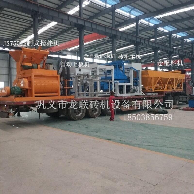 龙联10-15型砖机主机一台 (自动送板机、自动出板机、全自动电脑控制柜、液压站、自动布料机、随机自选一套耐磨砖机模具)专用工具一套、液压配件一袋。搅拌机、输送机、全自动码垛机、两箱配料机、水泥罐。