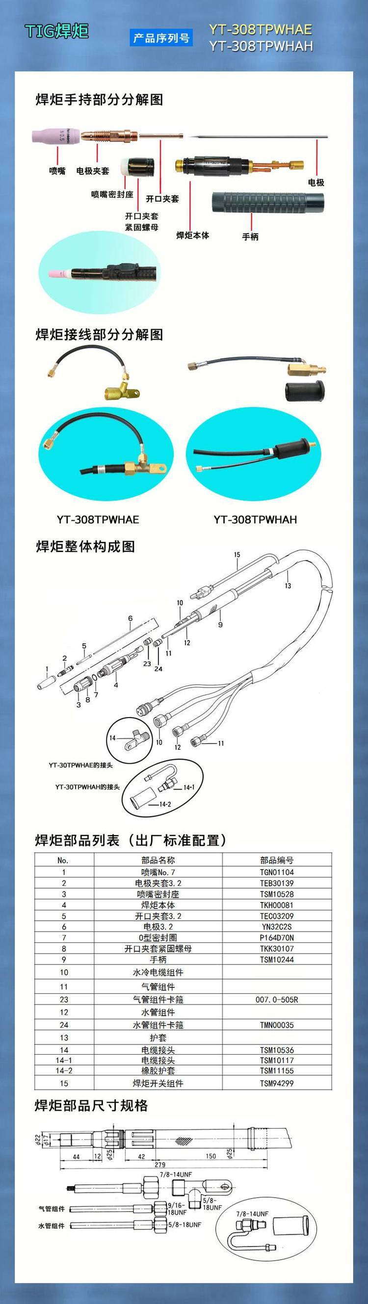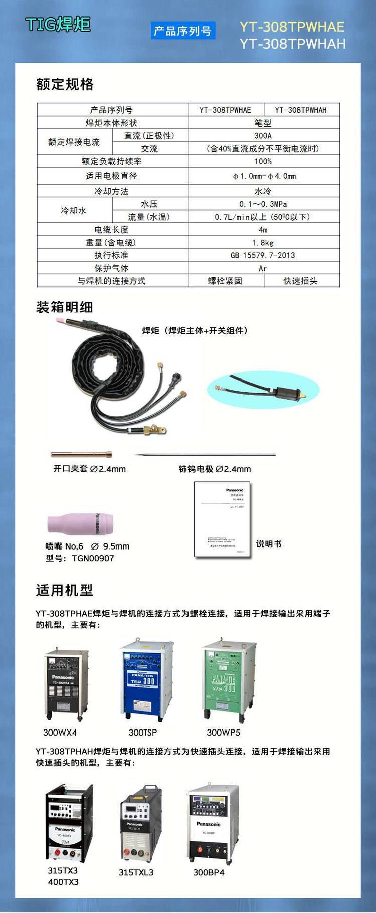 松下308TW/TPW系列TIG焊炬有端子和快插两种接口,电缆长度有4米和8米2种标准规格,也可以根据需要定制长度,建议不超过20米。枪头有角型(弯柄,型号为308TW)和笔型(直柄,型号为308TPW)2种型式,采用水冷方式。